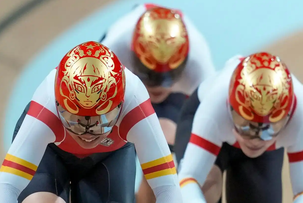 11月13日晚,第十五届全运会竞技体育场地自行车团体竞速赛决赛在香港举行,在相隔3分钟的两场决赛中,河南男女两队双双夺冠!其中,女队由奥运冠军鲍珊菊携手郭裕芳、骆书艳组成;男队由唐浩举、冯钰生、刘琦搭档。图为河南队选手鲍珊菊(前)在比赛中。