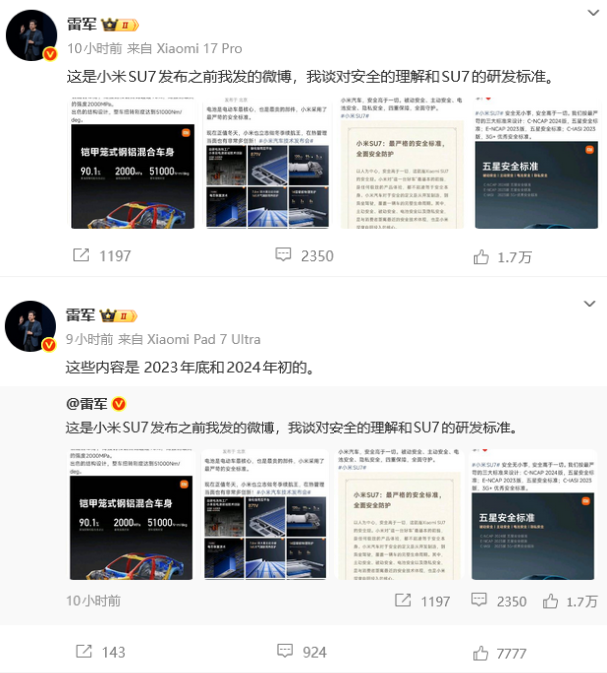雷军还晒出了自己在2023年和2024年发布的四条微博截图,发文称“这是小米SU7发布之前我发的微博,我谈对安全的理解和SU7的研发标准。”