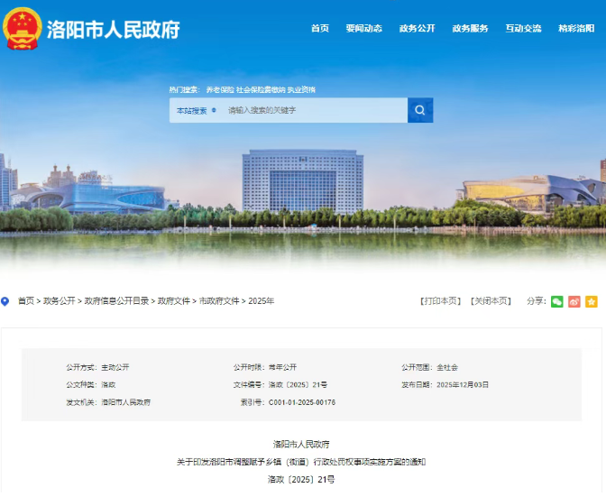 ●洛阳发布最新通知,调整赋予乡镇(街道)行政处罚权事项。将交通运输、水利、农业农村、消防救援等4个领域部分行政处罚权交由洛阳市辖区乡镇政府(街道办事处)行使。2025年12月15日至2026年12月31日为乡镇(街道)行政处罚权事项调整过渡期。(洛阳发布)