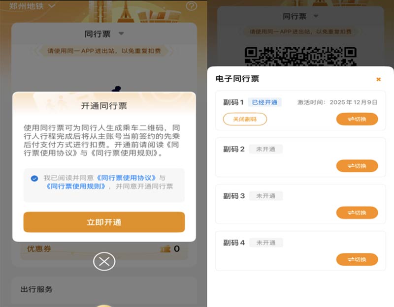 一人刷码,多人过闸!即日起,郑州地铁商易行App正式推出电子同行票功能,乘客打开商易行App乘车界面,选择同行票票种,开通电子同行票“副码”功能,即可实现一人带四人的快速过闸,仅支持绑定支付宝、微信及云闪付扣费方式,享受先乘车后付费及多人乘车一人付费的便捷乘车体验。