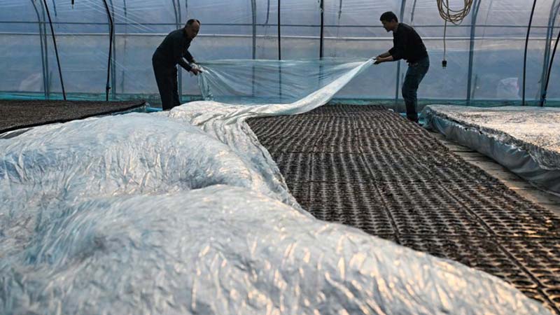 今天,我省迎来此次寒潮重头戏:断崖式降温、大范围雨雪、9级左右阵风组团来袭。多地积极应对大风降温天气,做好防范措施。图为:12月11日,在商丘市夏邑县会亭镇朱瓦房村大棚育苗基地,村民为刚刚下种的育苗苗床覆盖薄膜保温。