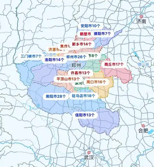 郑州230;开封214;洛阳234;平顶山142;安阳200;鹤壁153;新乡212;焦作216;濮阳232;许昌195;漯河232;三门峡52;南阳208;商丘254;信阳218;周口228;驻马店226;济源254。