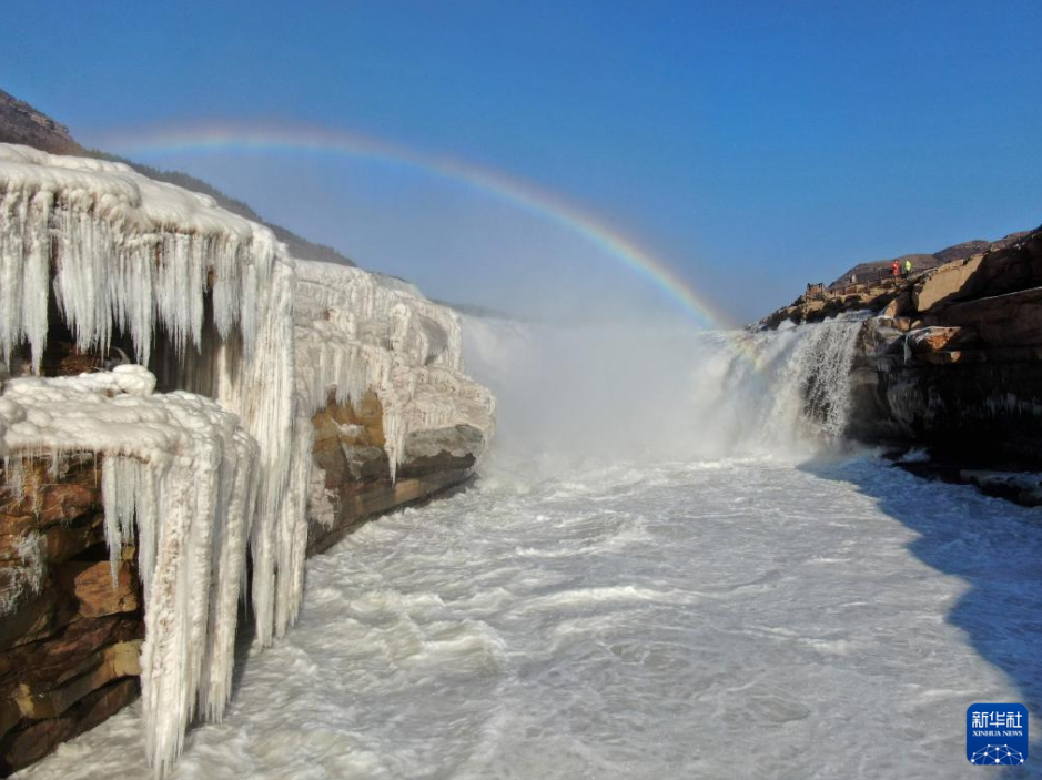 受持续降温天气影响,位于山西吉县和陕西宜川县交界的黄河壶口瀑布形成“冰瀑玉壶”壮美景观,层层叠叠的冰瀑与瀑布上空的彩虹相映成趣,美不胜收。图为:1月6日在山西吉县黄河壶口瀑布景区拍摄的“冰瀑玉壶”和彩虹景观。