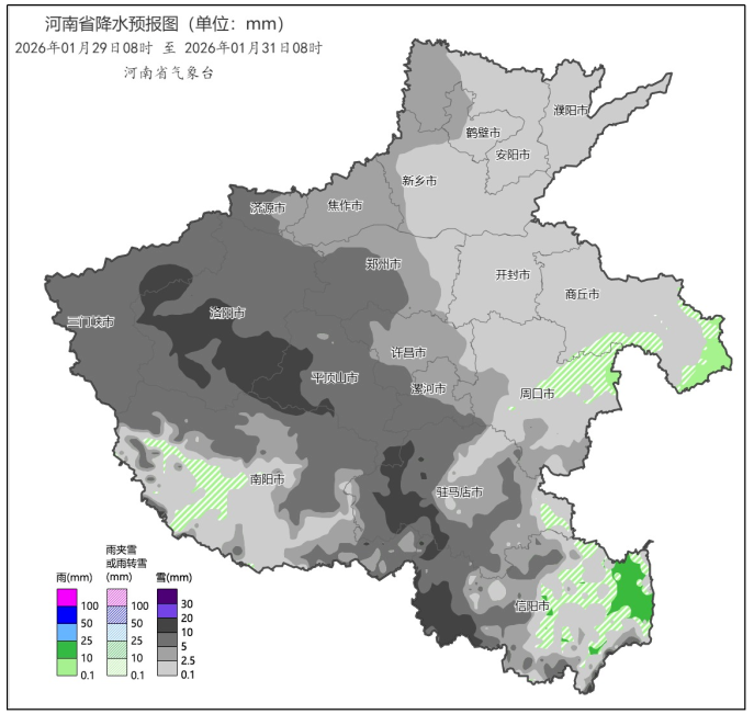 ●预计今天夜间到明天早晨,北中部、西南部有大雾。今天下午到明天全省大部有轻到中度霾,北中部部分县(市、区)有重度霾。受西南暖湿气流和冷空气共同影响,预计29日至30日我省将有一次明显降雪天气过程。(河南气象)