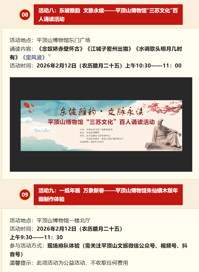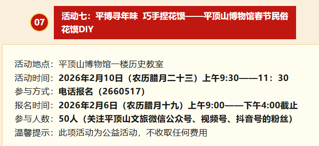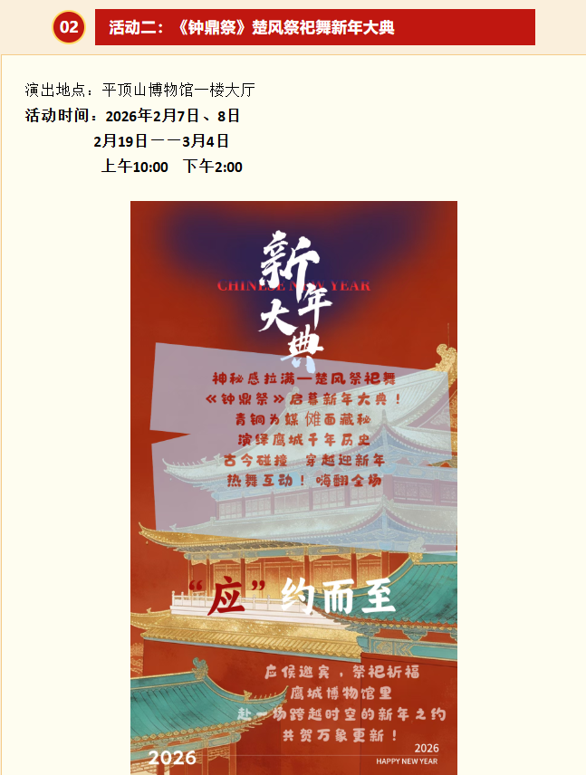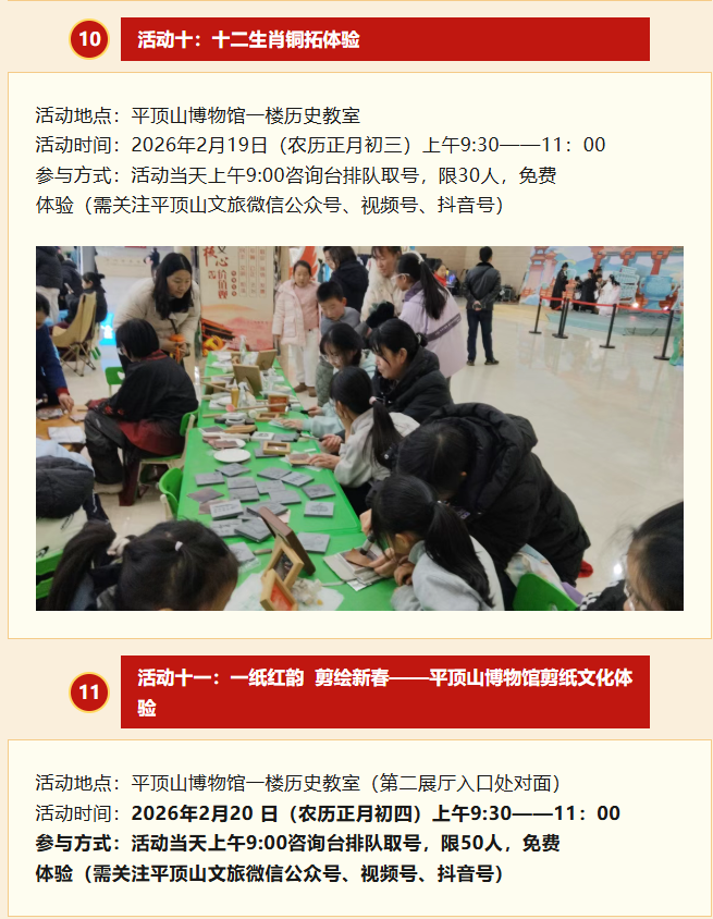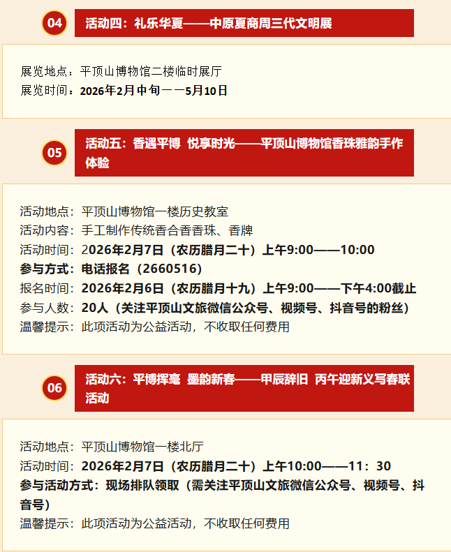 2月7日(农历腊月二十)至3月4日(农历正月十六)平顶山博物馆26项特色活动轮番上阵,邀你沉浸式解锁“博物馆里过大年”的新潮打开方式。(部分截图)