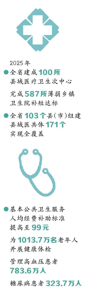 2025年,全省建成100所县域医疗卫生次中心,完成587所薄弱乡镇卫生院补短达标;全省103个县(市)组建县域医共体171个,实现全覆盖;基本公共卫生服务人均经费补助标准提高至99元,为1013.7万名老年人开展健康体检,管理高血压患者783.6万人、糖尿病患者323.7万人,服务的规范化、均等化水平不断提升……