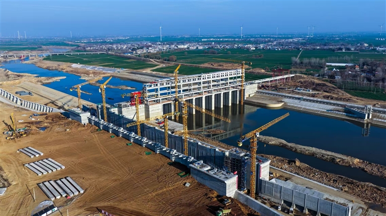 冬日里的唐河,水波粼粼,两岸沃野铺绿。复航主体工程之一的郭滩枢纽,已巍然屹立在河道之上,船闸静立、机械低鸣。一名身着工装的管理人员,正沿着河道仔细巡查设备调试情况。