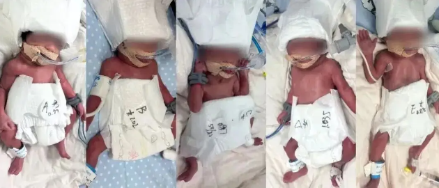 2月26日凌晨3时许,一位来自新疆的24岁产妇在武汉成功分娩五胞胎。体重分别为:老大男宝990克、老二女宝1020克、老三女宝970克、老四女宝1030克、老五女宝870克,新生儿评分均在6分以上,生命体征相对稳定。医学数据显示,全球自然受孕五胞胎的出生概率仅为六千万分之一,堪称生命的极致奇迹。