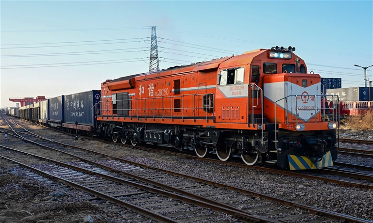 2026年首列中老铁路国际货运班列(洛阳—老挝琅勃拉邦)从东方红(洛阳)国际陆港驶出。 王铮 李卫超 摄