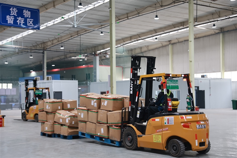 3月30日,郑州机场中大门前置货站内,一批跨境电商货物顺利完成海关申报、查验、安检等全流程作业,经专用驳运车辆运抵机场装机发往欧洲。全媒体记者 聂冬晗 摄