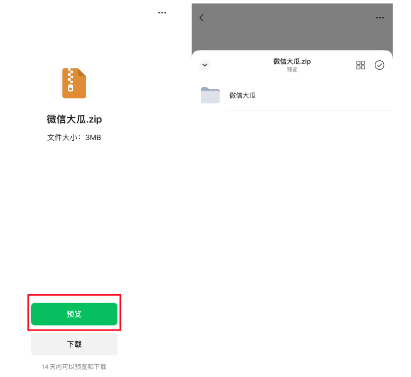 3月31日,微信派发文宣布微信一项新功能:微信支持压缩包直接预览了。点开压缩包选择预览,不需要下载、不需要额外解压,就能一眼看全压缩包内容。文件再大,也不会占存储空间。