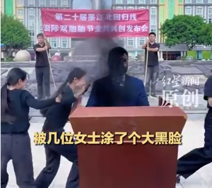 4月1日,云南墨江一发布会现场,文旅局长杨春德讲话时,被几位女士涂了个大黑脸,杨春德坚持发布完消息后也抹黑对方。4月2日,普洱市相关负责人告诉红星新闻记者,墨江将在下月初迎来第20届墨江北回归线国际双胞胎节,而抹黑脸狂欢是该节核心活动之一,为了打破以往一本正经的传统发布形式,墨江节会宣传组策划了这场微发布。