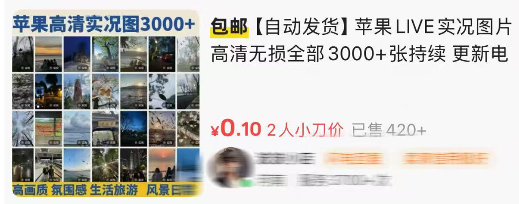 搜索购物软件和二手交易平台可以发现,多家店铺都在售卖名为“朋友圈实况图片”的商品,价格集中在1元—8元。商家在商品详情页标注“可用于朋友圈配图、社交媒体起号”等。据中央广播电视总台中国之声报道,这些实况照片,包括国内外的旅游风景、购物美食等生活日常,以及单人进行高尔夫、滑雪等运动的实况照。