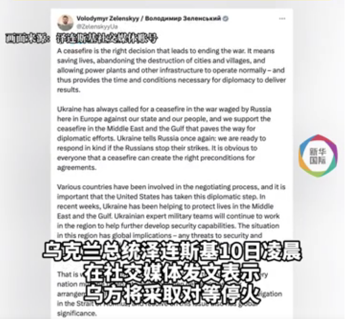 ●乌克兰总统泽连斯基10日凌晨在社交媒体发文,就俄罗斯早前宣布将在东正教复活节期间停火32小时,表示乌方将采取对等停火。俄罗斯克里姆林宫9日晚宣布,俄总统、武装力量最高统帅普京决定,鉴于东正教复活节即将到来,俄方宣布从莫斯科时间11日16时至12日24时停火,希望乌克兰跟进。(新华社)