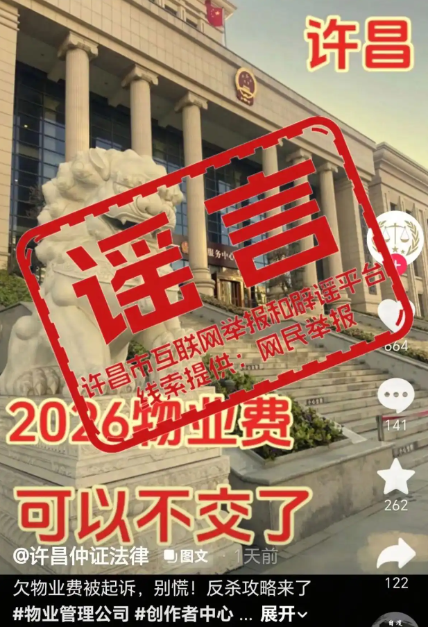 据“网信许昌”昨日发布消息,近日,某平台账号 “许昌仲证法律” 发布信息称 “许昌 2026 物业费可以不交了”,经核实,许昌市物业费严格按照《许昌市物业管理办法》执行,实行市场调节价,不存在 “2026 年不用交物业费” 的相关政策,网传信息为不实信息。