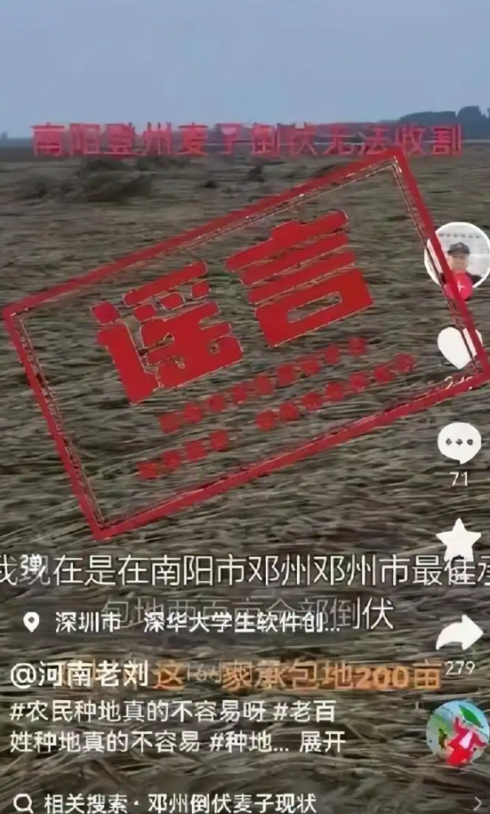 ●南阳邓州小麦倒伏无法收割?假信息!