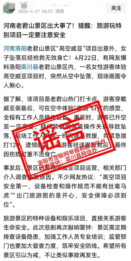 ●近日,某平台账号“远见卓识香瓜PWC47P”编造并发布虚假信息,称“老君山景区‘高空威亚’项目发生意外,一名女子坠落后经抢救无效身亡”。经洛阳市栾川县文旅、应急管理等部门核实,老君山景区并无高空威亚类游乐项目,未发生相关安全事故及人员伤亡事件,网传内容纯属谣言。(清朗河南)