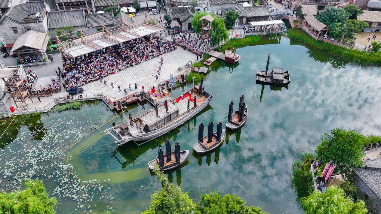 在距离建业电影小镇仅三分钟车程的只有河南·戏剧幻城景区,21个剧场里,讲述黄河文明与中原文化的戏剧不间断上演,两部新剧《曹操的麦田》《苏轼的河南》演绎着英雄人物与河南的种种故事,自今年上映以来饱受好评。坐落在地坑院的三所非遗店,将非遗做到极致,极具古韵的场景设计、画彩扇拓版画等特色体验也吸引了不少游客驻足。