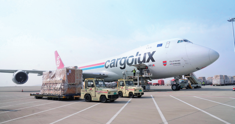 一架卢森堡货航的货机在郑州机场装卸货物(2025 年 11 月 4 日摄)中豫航空集团供图