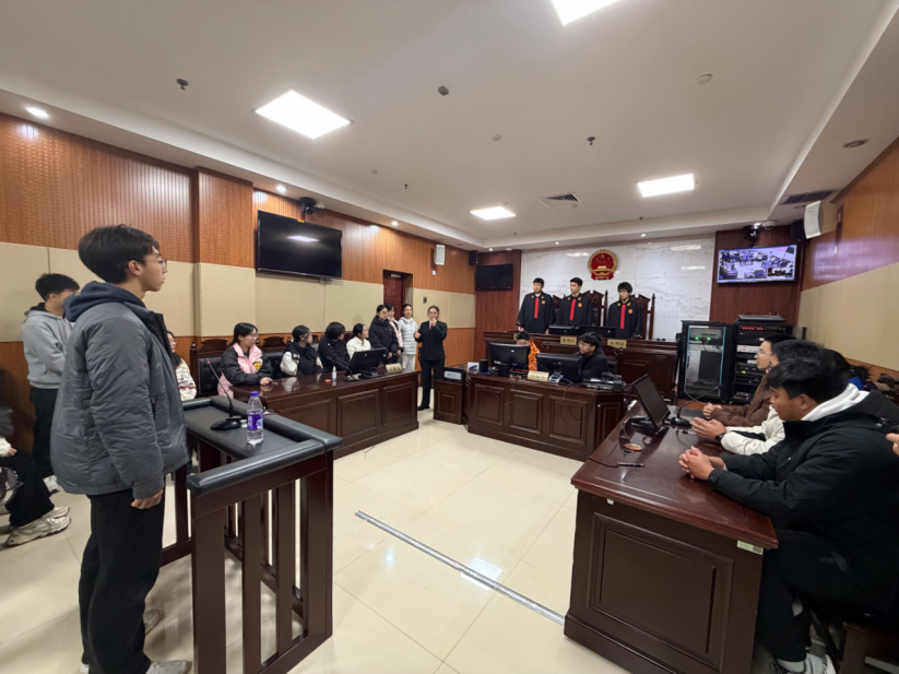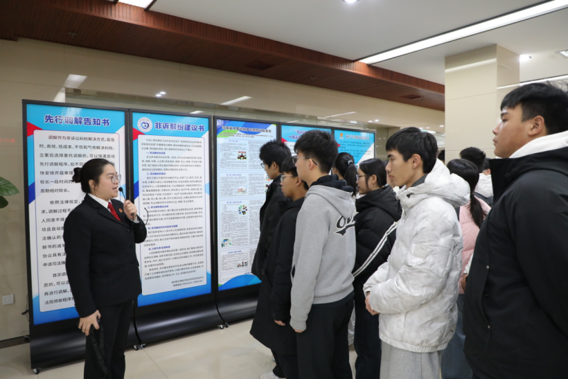 “公众开放日”环节,法院变身“沉浸式”法治教育课堂。在诉讼服务中心,法治宣传员巧用比喻激发起同学们浓厚兴趣:“这里就像法院的‘服务便利店’,提供从咨询、立案到调解等各种服务,可以‘一站式’解决老百姓的诉求。”