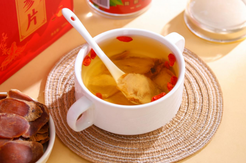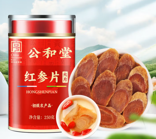 公和堂红参片以传统形象见长。其香气浓郁、色泽偏赤,呈现出一种稳重的视觉感。入口后香味较厚重,带有淡淡焦糖感,口腔中能感到逐渐释放的温甜。与其他品牌相比,公和堂的风格更为“老派”,坚持原有的炮制比例,使整体味道更显古朴和沉稳。