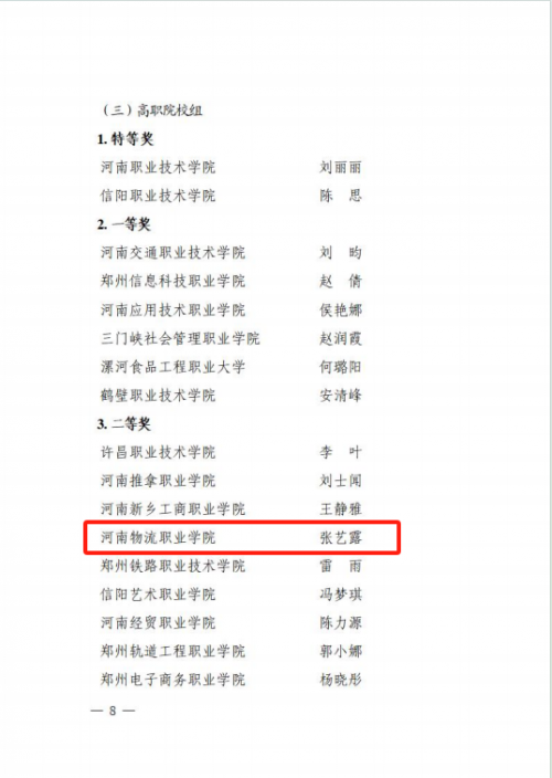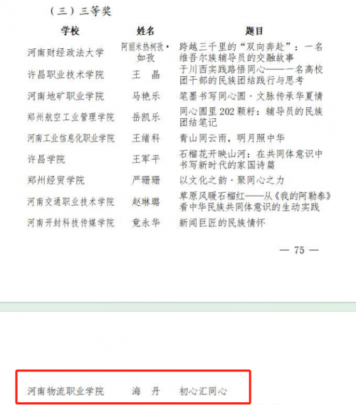 近日,河南省民族宗教事务委员会、省教育厅、省体育局公布“豫来豫亲——铸牢中华民族共同体意识主题教育”实践活动结果,河南物流职业学院师生荣获佳绩。其中,张艺露老师荣获《中华民族共同体概论》课程教学展示高职院校组二等奖;海丹老师荣获铸牢中华民族共同体意识主题征文比赛管理组三等奖;贺庆康同学荣获铸牢中华民族共同体意识主题征文比赛学生组二等奖,高凡同学荣获铸牢中华民族共同体意识主题征文比赛学生组三等奖;曹鑫琳、杨东冉、葛超凡、程俊澎、刘星、李瑞颖等6名同学荣获中国特色社会主义民族宗教理论知识网络答题优秀参与奖。